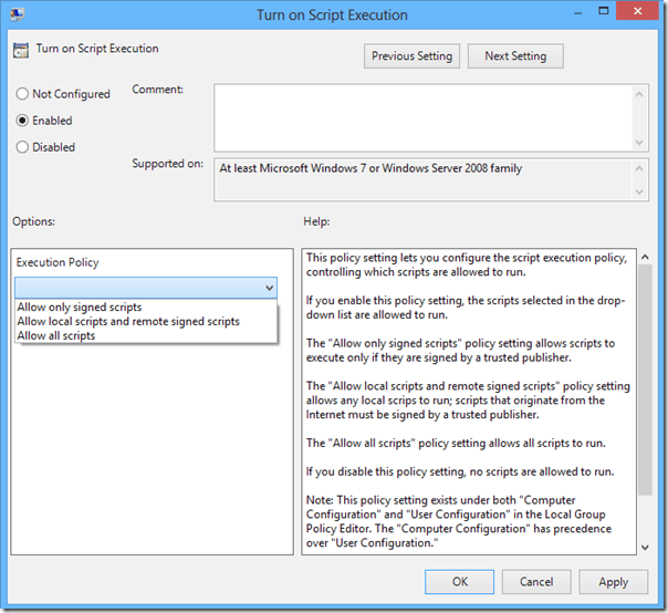 - 設定をダブルクリックしてください。ドロップダウンから有効にするものを選択します。
