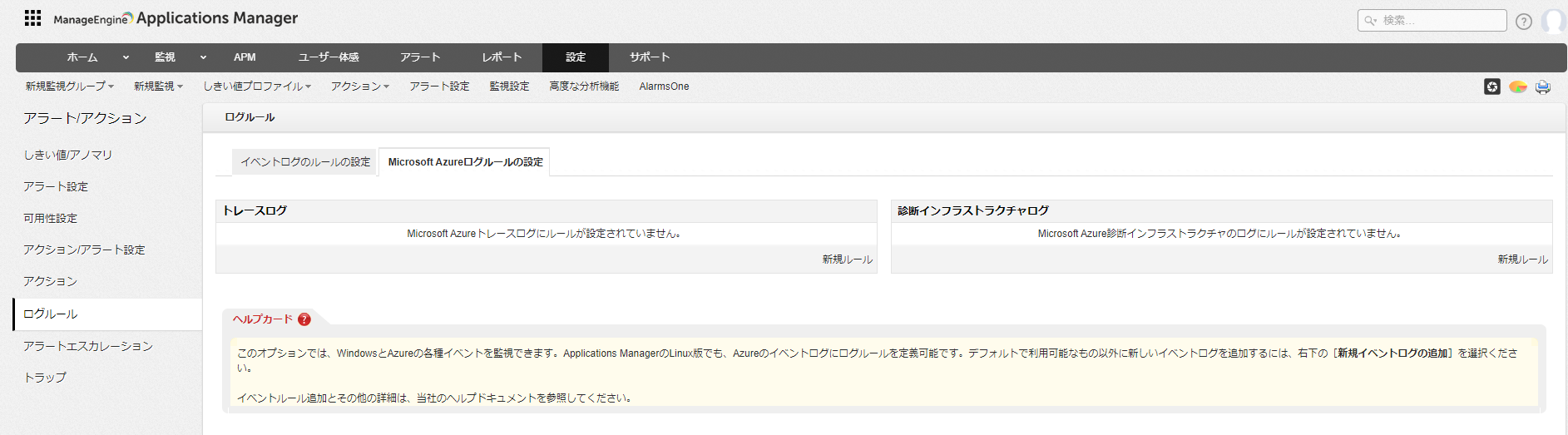 [設定]→[アラート/アクション]→[ログルール]→[Microsoft Azureログルールの設定]