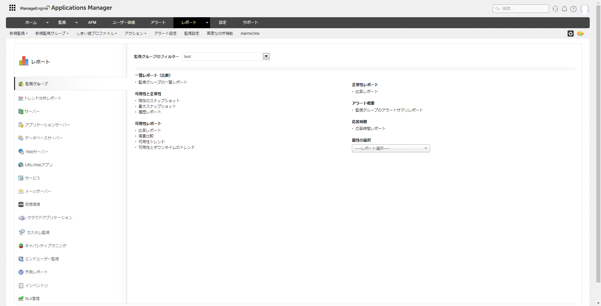Applications Managerのレポートでは、監視グループや監視タイプごとに様々なレポートタイプを表示します。