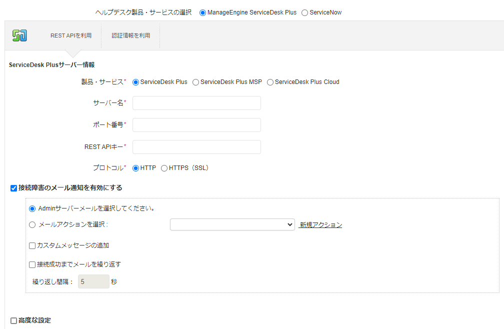 - [REST APIキー]:ServiceDesk Plus上で発行したREST APIキーを入力