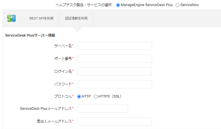 - Applications ManagerでServiceDesk Plusを連携するには、REST APIを使用または認証情報を使用の2つの方法があります。