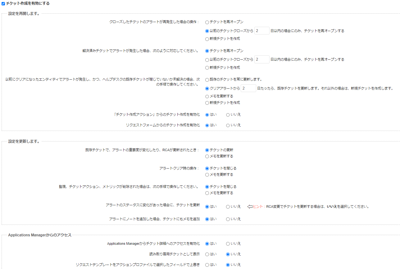 - アラートの重大度が変更されたとき、または、すでに作成されたチケットのアラートのRCAが更新されたときに、次のいずれかのアクションを実行するようにApplications Managerで設定します。