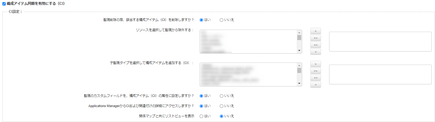 詳細設定チェックボックスをクリックし、[構成アイテム(CI)同期を有効にする]オプションを有効にすると、次の構成アイテム設定を変更できます。