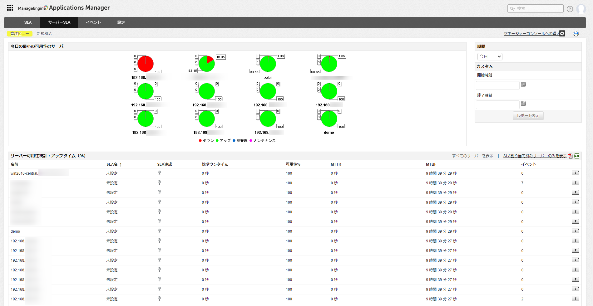 サーバーごとの、SLA状況(達成状況、総ダウンタイム、可用性、MTTR、MTBF、イベント数)をテーブル形式で表示します。