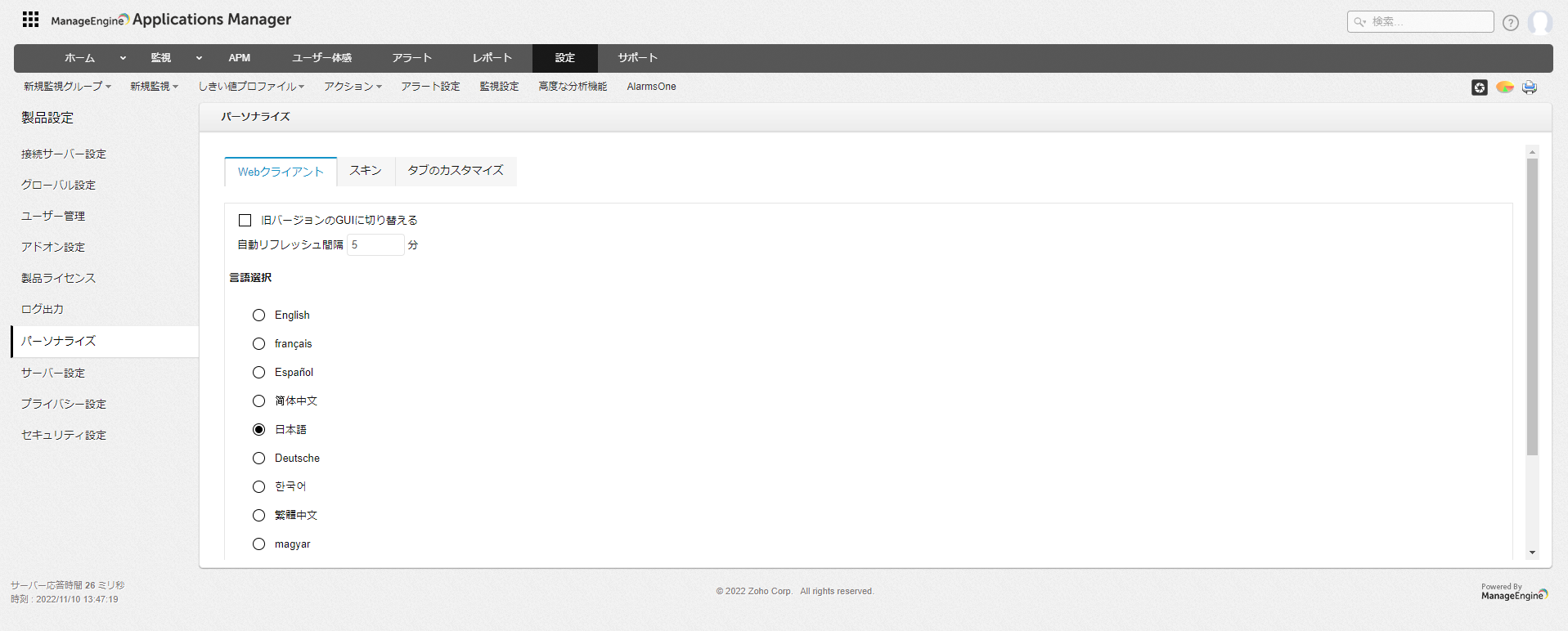 WebUIで表示する言語や、画面表示のリフレッシュ間隔を設定します。