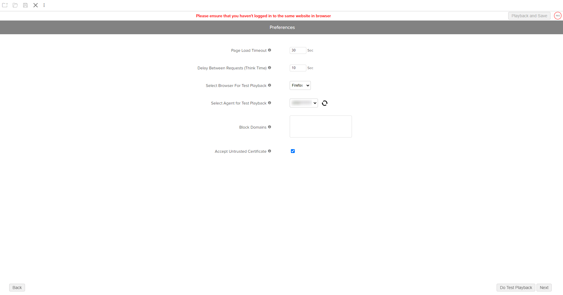 • Accept Untrusted Certificate:オプションを有効にすることで、ブラウザーで再生中に証明書エラーが発生しても無視されます。
