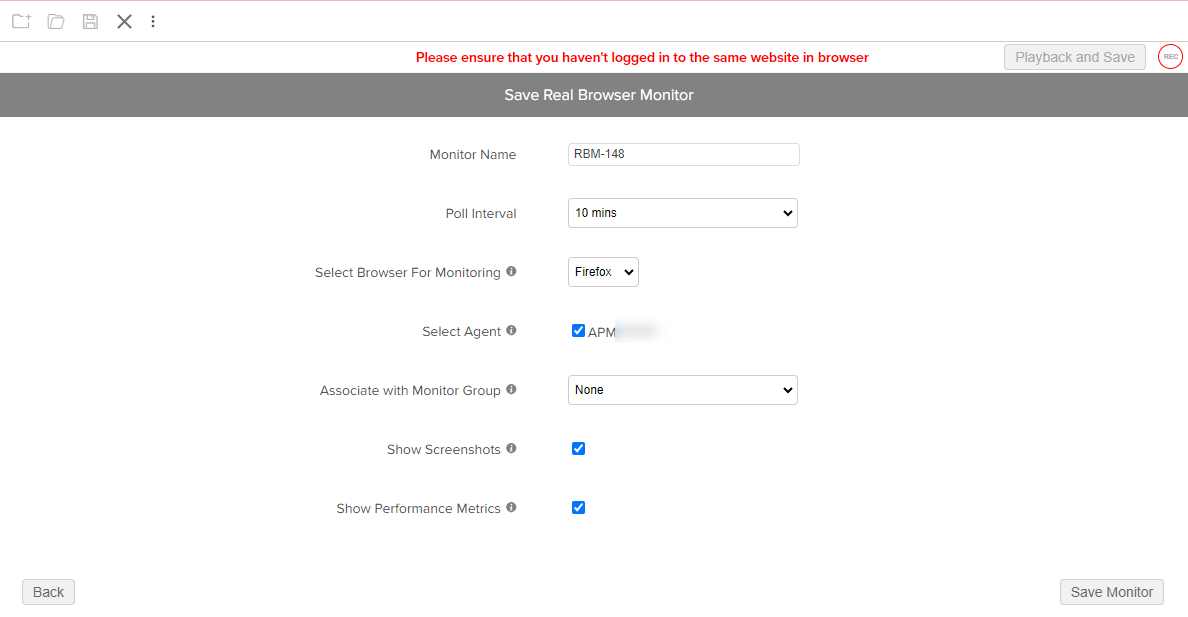 [Save Real Browser Monitor]ページで監視の設定を行います。