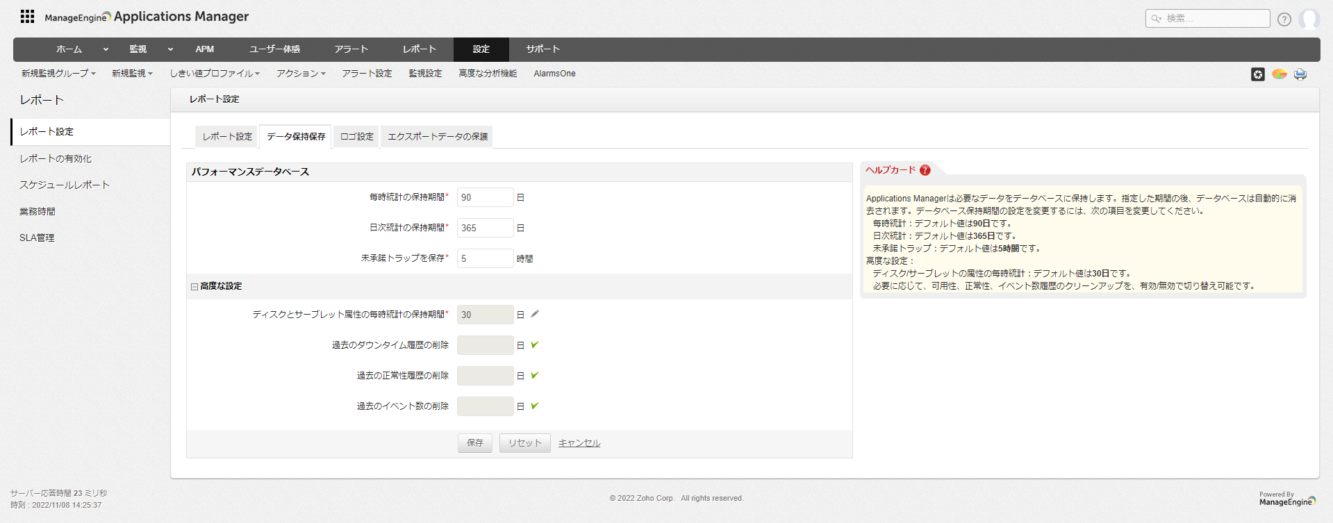 グラフ描画やレポート生成に必要な監視データの保存期間を設定します。