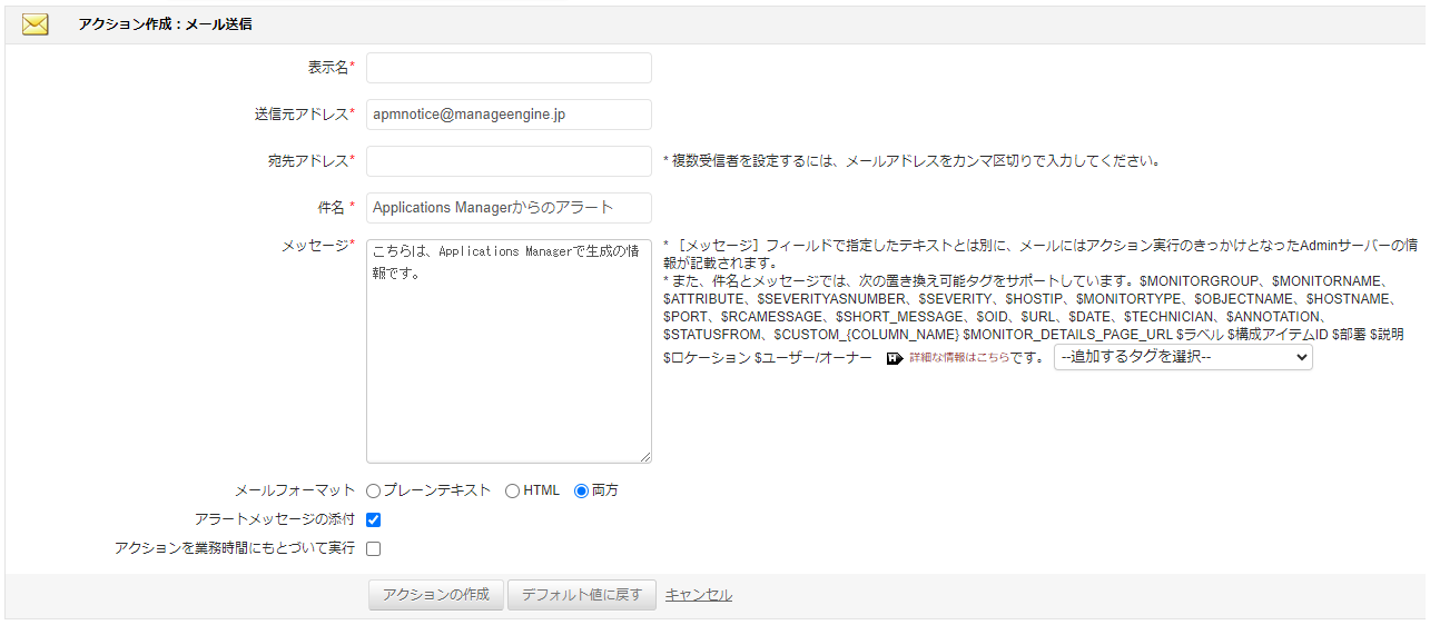 メールにApplications Managerが作成したアラート情報を添付する場合はチェックを入れます。 - アクションを業務時間にもとづいて実行