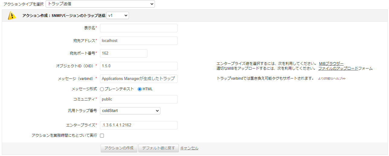 - [アクション]タブをクリックし、新規アクションの作成から[トラップ送信]を選択
