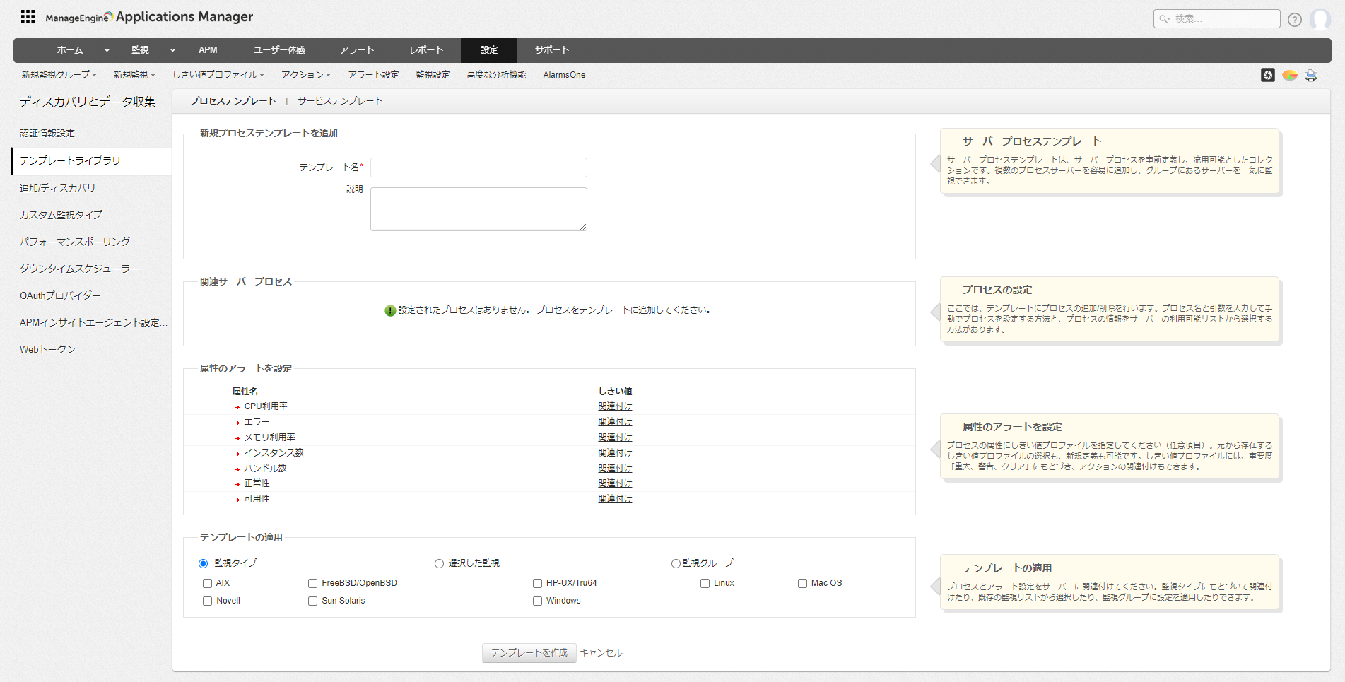 - [設定]→[ディスカバリとデータ収集]→[テンプレートライブラリ]→[プロセステンプレート]画面右上の[新規追加]をクリック