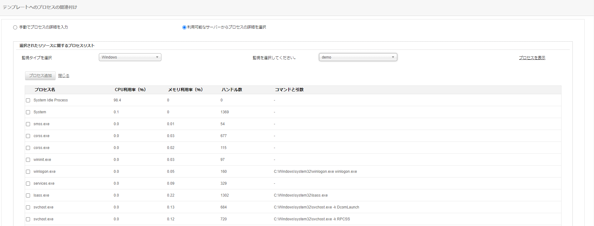 監視対象サーバーで稼働しているプロセスを一覧で表示します。必要なプロセスを選択し、[プロセス追加]から追加します。