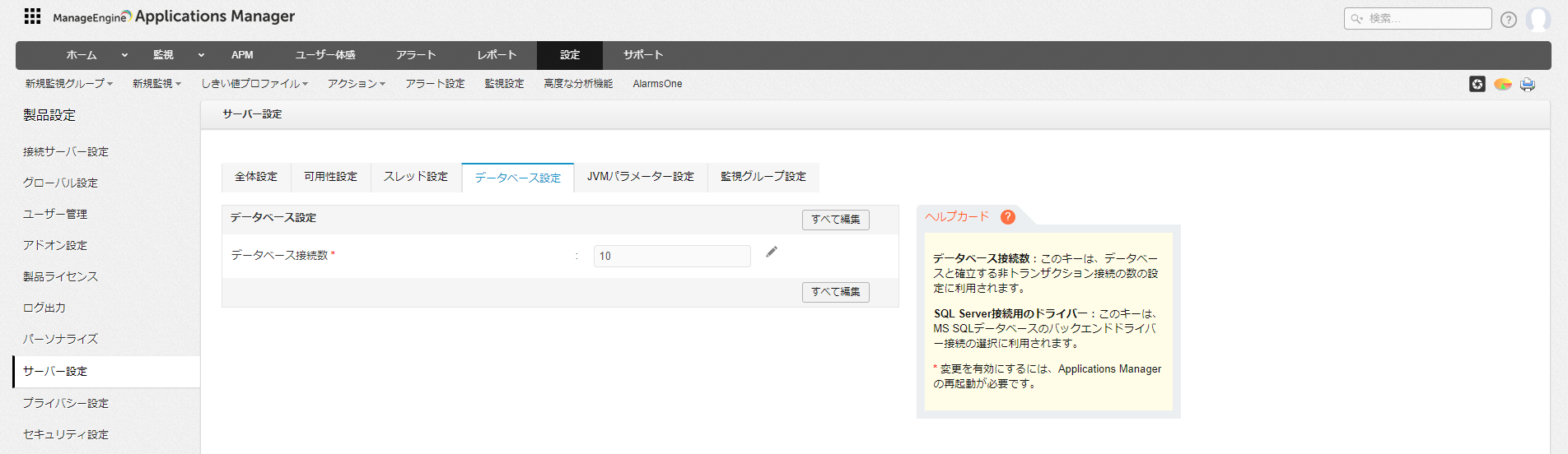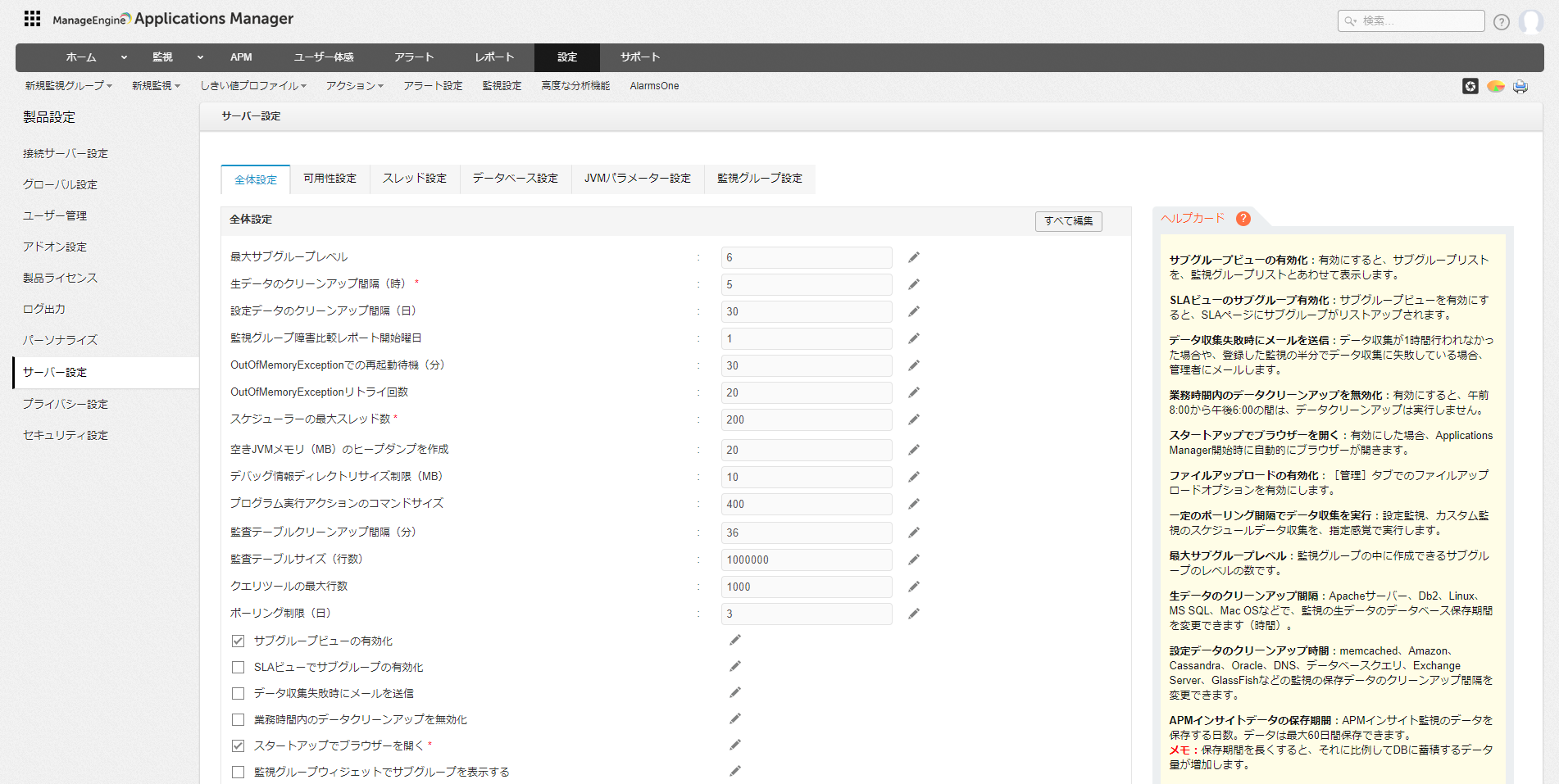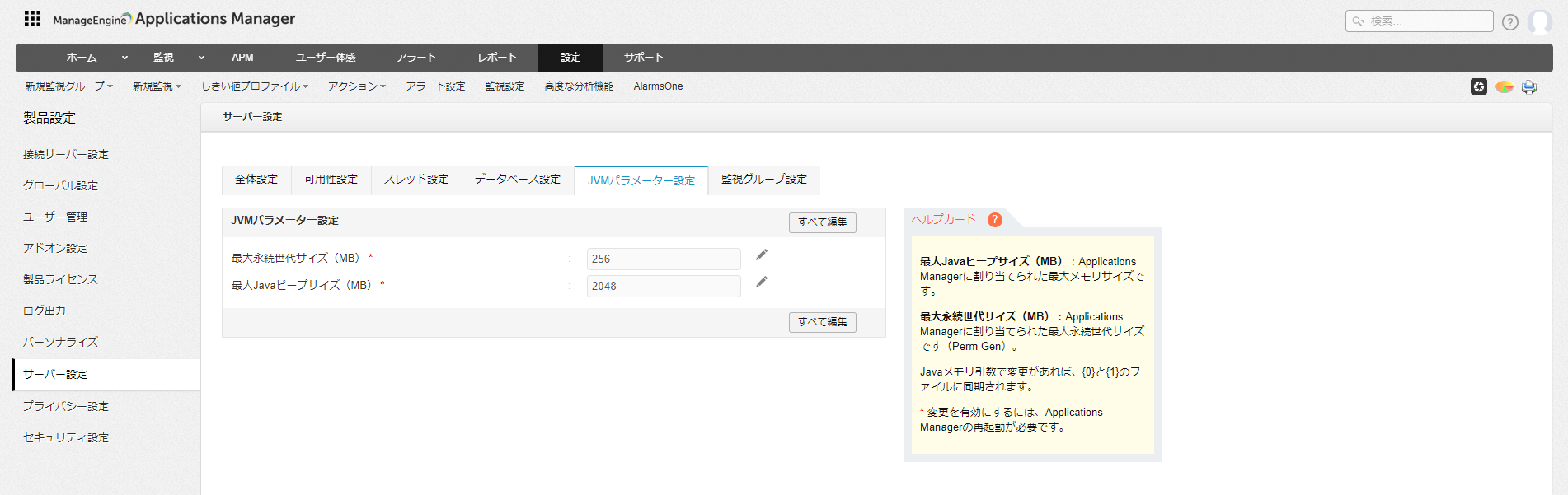 スレッド数や製品データベース、JVMのパラメーターなど、製品全体の動作に関連した設定を行います。