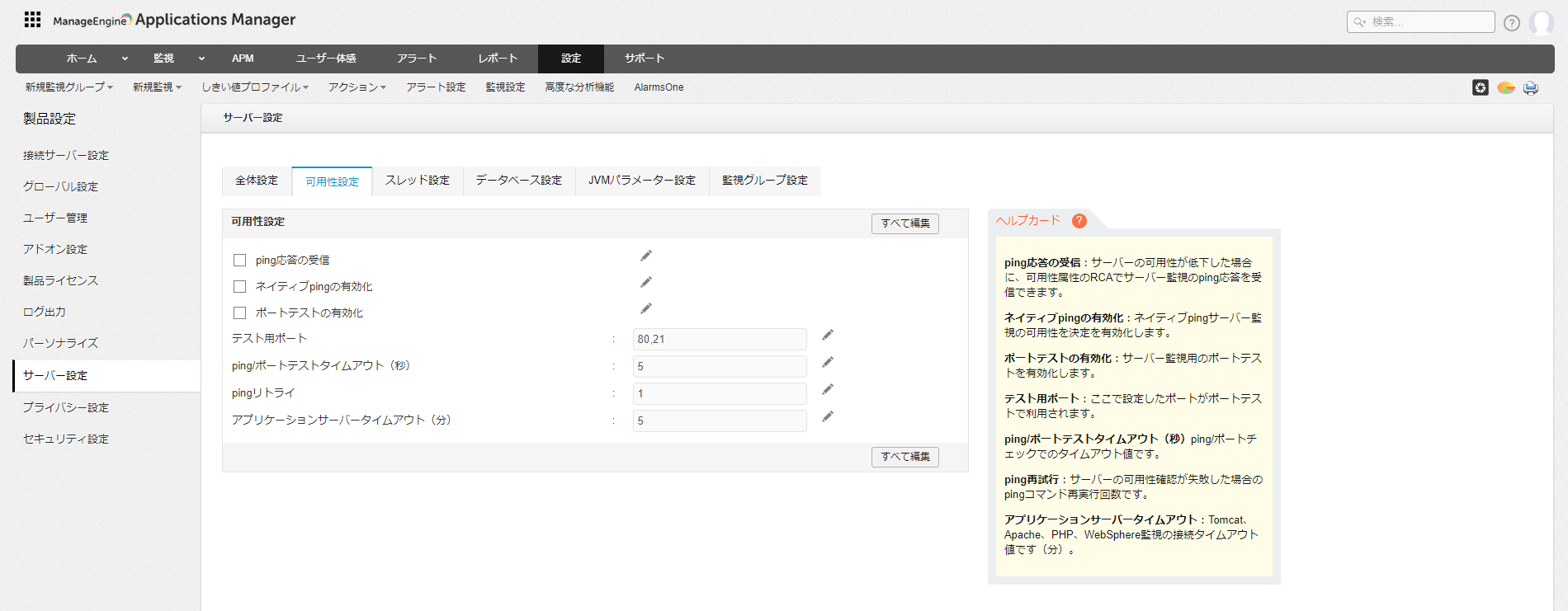 | ネイティブpingの有効化 | ネイティブpingをサーバー監視の可用性の判定に使用するよう許可します。 |