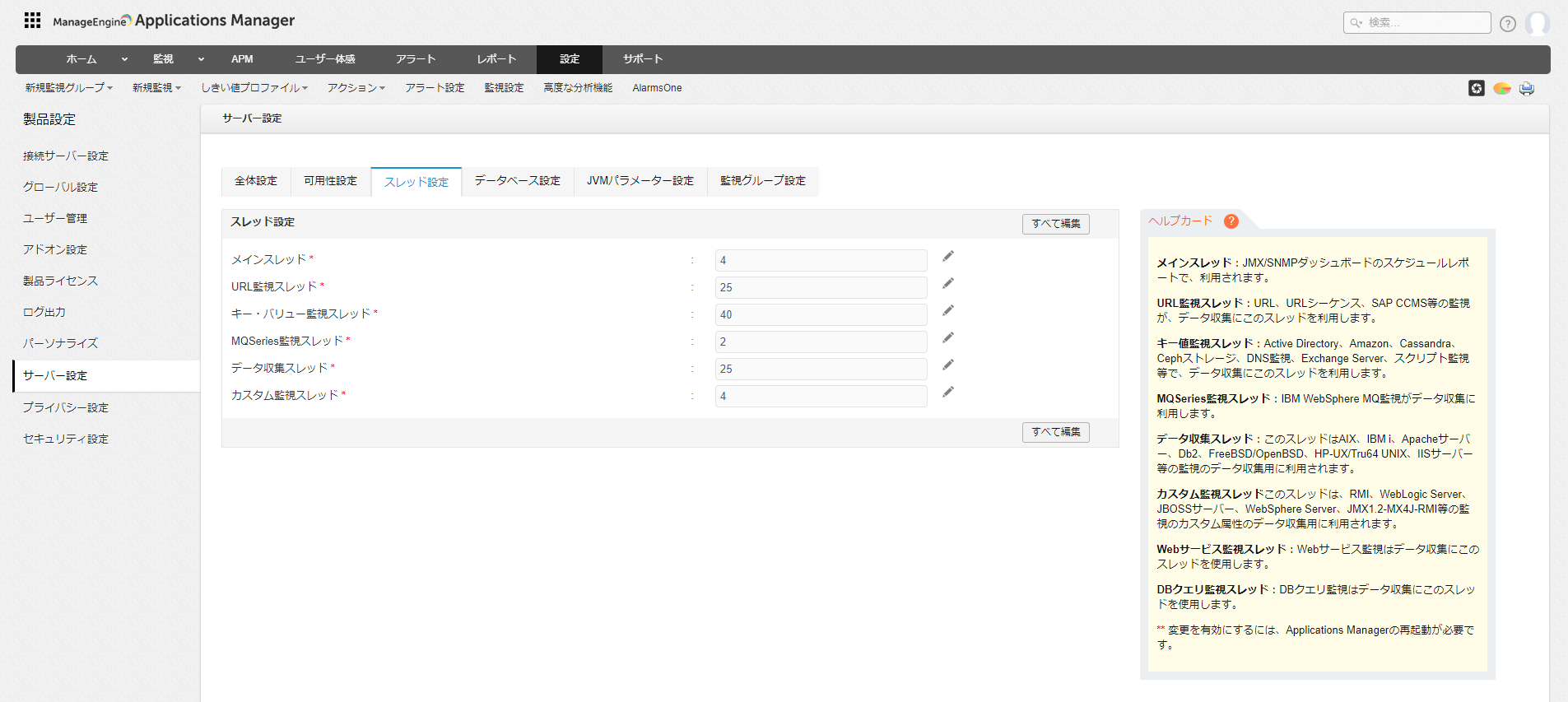 | メインスレッド* | JMX/SNMPダッシュボード、スケジュールレポートのデータ収集時に使用するスレッド数を指定します。 |