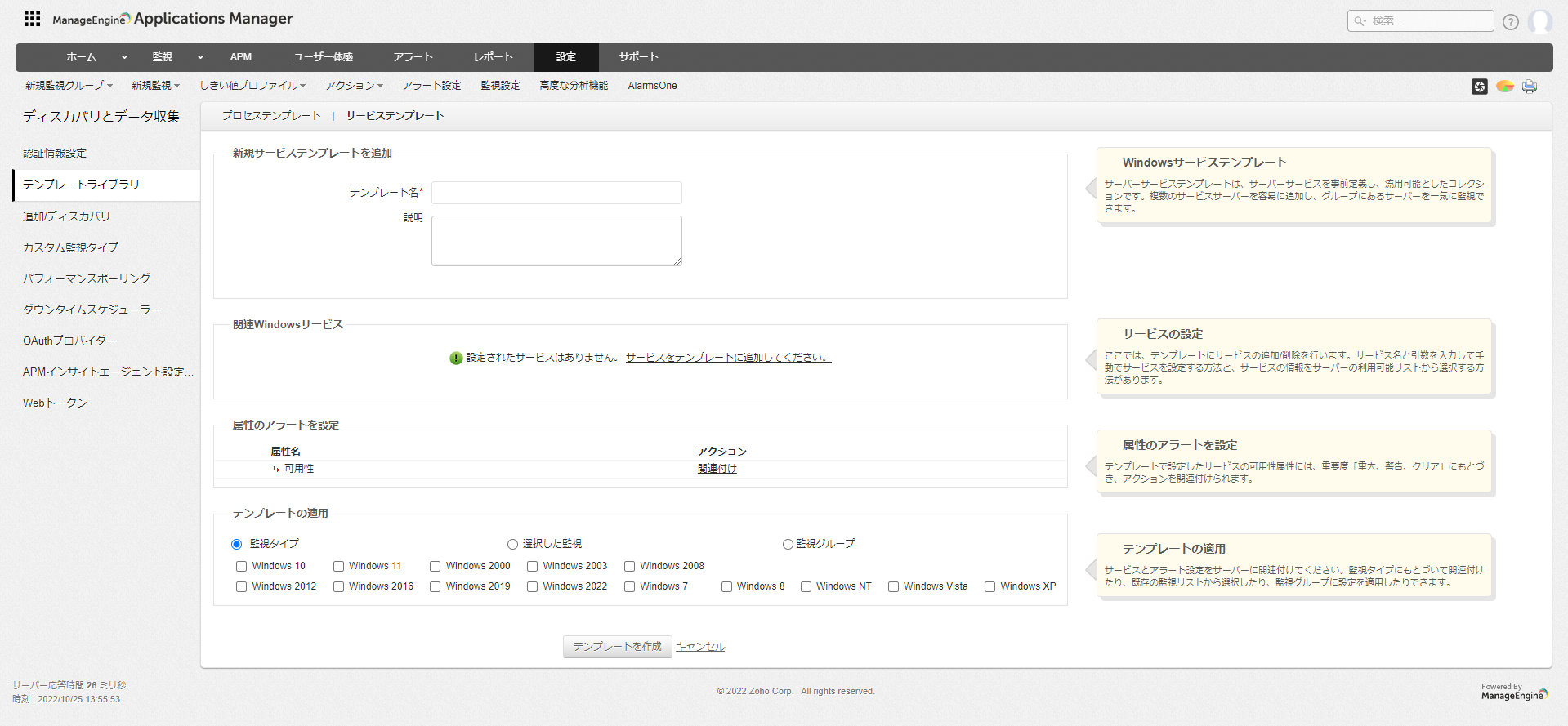 - [設定]→[ディスカバリとデータ収集]→[テンプレートライブラリ]→[サービステンプレート]画面右上の[新規追加]をクリック