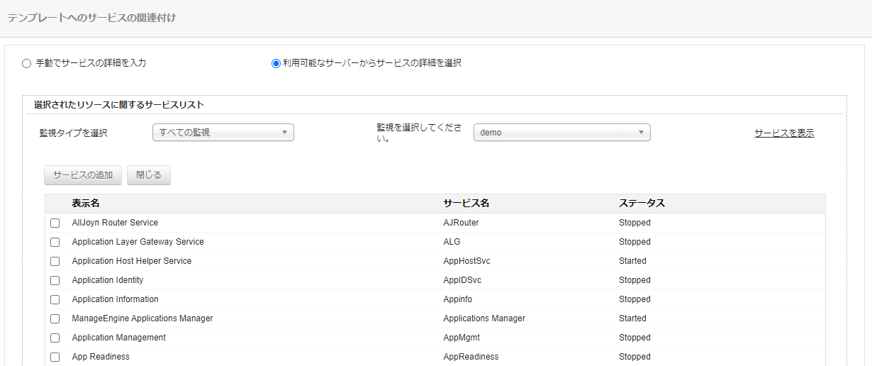 必要なサービスについて、[サービス表示名]と[サービス名]を手動で入力し、[サービスをテンプレートに追加してください。]から追加します。 - 利用可能なサーバーからサービスの詳細を選択