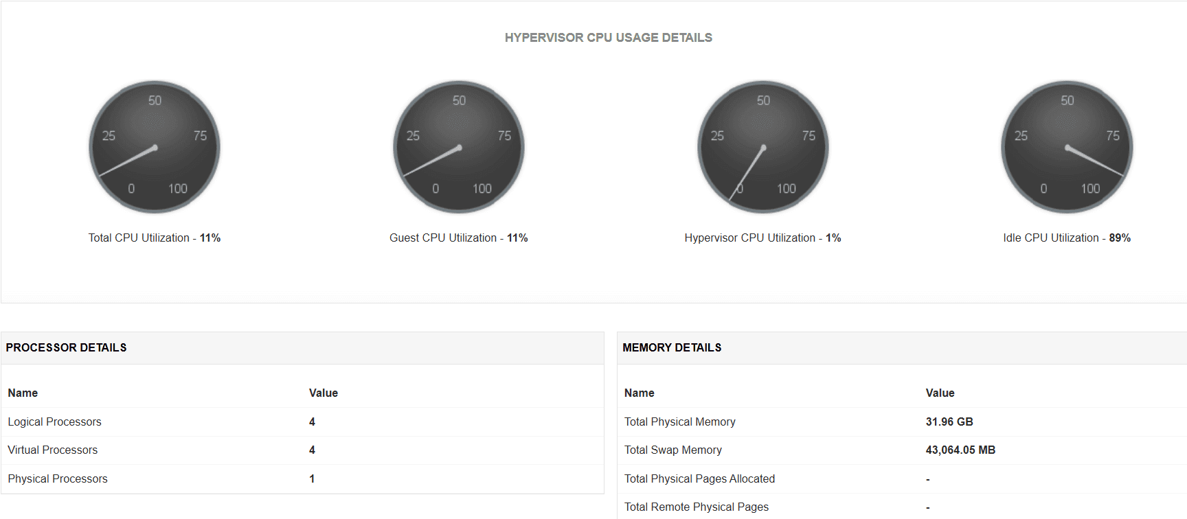 Applications ManagerのHyper-V監視機能により、リソースを消費しているサーバーの概要を確認でき、必要なアクションを実行可能です。メトリクスとして、上位のゲスト仮想マシンにおける、各CPUの使用率と合計、アイドルCPU使用率、メモリー使用率を把握できます。