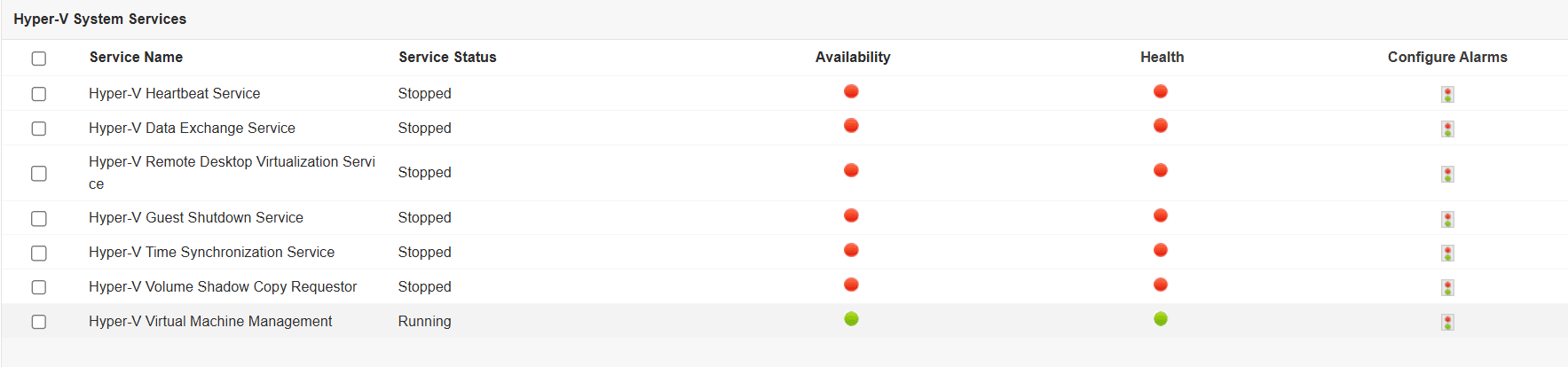 イメージ管理サービスや仮想マシン管理サービス、ネットワーク管理サービスなどのHyper-Vサービスの可用性と状態を確認することは重要です。Applications Managerから、これらのサービスの有効化、無効化、削除が可能です。