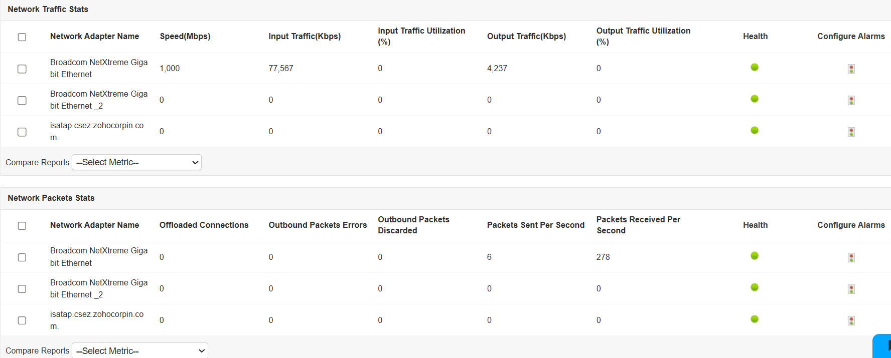 Hyper-Vパフォーマンス監視機能により、ネットワークインターフェース、仮想ネットワークアダプター、レガシーネットワークアダプター、仮想スイッチに関して、正常性と状態を監視します。入出力別トラフィックの使用率、オフロードされた接続、パケットディスカード、データ受信速度、データ転送速度、送受信パケット、インターフェースの正常性などの項目を通じて、パフォーマンスを把握できます。