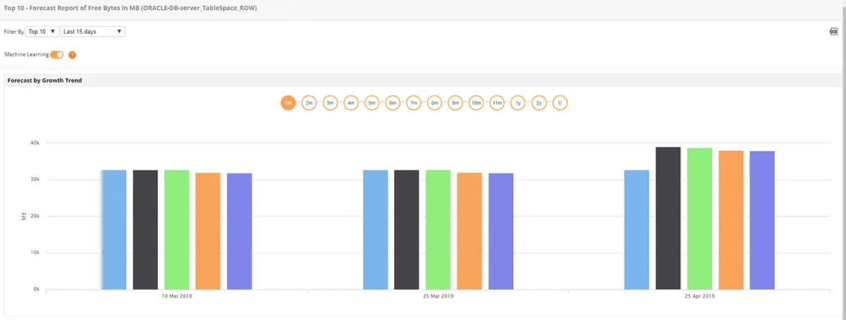 すべてのOracleデータベース項目に関して、グラフおよび過去のパフォーマンスを表示できます。トレンド分析レポートにより、パフォーマンスの傾向をより正確に分析可能です。Applications ManagerのOracleパフォーマンス監視機能を用いると、予測分析を行うレポートを表示でき、今後の計画立案などに役立てることができます。