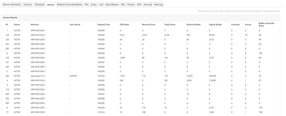 Applications ManagerのOracle監視機能を使用すると、Oracleセッションを通じてサーバーの負荷の状況を把握し、データベースを簡単に最適化できます。セッション、セッションユーザー、セッションの概要、セッション待機に関して詳細を表示します。