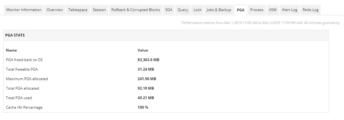 リソース使用量とクエリの待機時間を最適化するには、メモリー内でデータを効率的に保存することが重要です。Applications ManagerのOracle DB監視機能では、PGAとSGAに関する統計を確認することで、Oracleデータベースのメモリー構造とプロセスを監視できます。