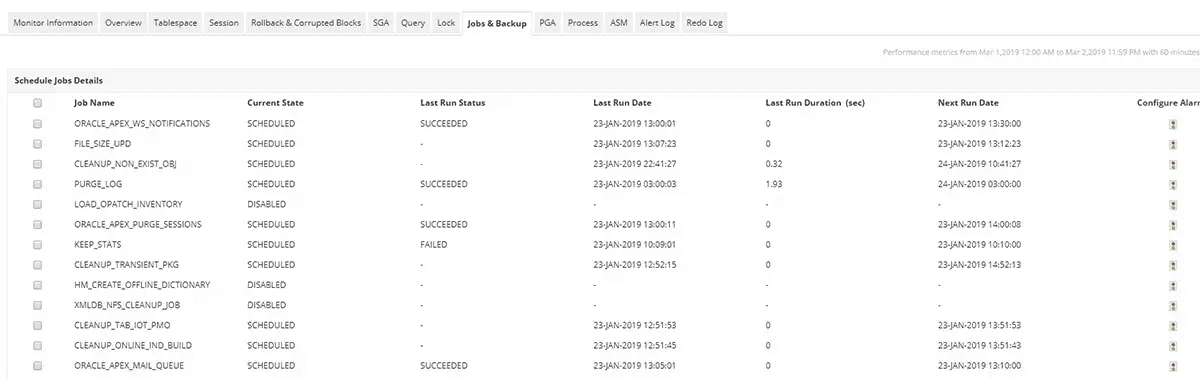大半のOracleサーバー監視ツールでは、データベースの正常性と可用性に関する表層的なメトリクスしか確認できません。一方、Applications ManagerのOracle監視機能では、Oracleジョブやバックアップジョブなど、他の多くのメトリクスのパフォーマンスとステータスを把握可能です。ジョブのステータス、最終実行ステータス、最終実行期間、実行回数、および失敗回数に関する情報から、Oracleデータベースの効率性を明らかにできます。