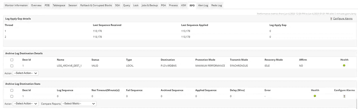 Applications Managerには、プライマリデータベースのアーカイブログの詳細を表示する専用のRPOタブがあり、ログの出力先のステータスに加えて、保護モード、送信モード、リカバリモードを確認できます。Oracle Data Guard環境の物理スタンバイ・モードおよび論理スタンバイ・モードで作成されたデータベースは、Oracle監視コンソールを通じて状況を確認することも可能です。