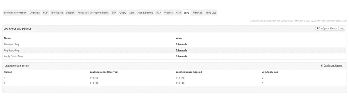 Applications ManagerなどのOracle監視ツールは、ログ適用ギャップとログ適用遅延メトリクスを監視して、スタンバイデータベースがプライマリデータベースからどの程度遅れているかを把握できます。遅延によるデータ損失を防ぐため、これらのメトリクスの監視は、プライマリインスタンスとスタンバイインスタンスの同期を改善するのに役立ちます。