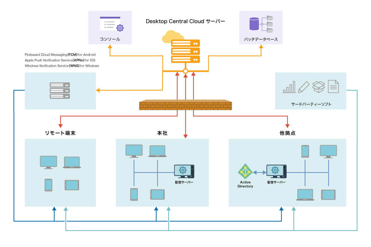 地理的に分かれている拠点を管理する場合は、拠点のコンピューターの1 台に配信サーバーをインストールします。配信サーバーは、Endpoint Central Cloudと通信して、その拠点のエージェントに関係するタスクを取得します。さらに、配信サーバーは、拠点内のコンピューター/デバイスで欠落しているパッチの情報について、Endpoint Central Cloudと同期します。これらのパッチは、各ベンダーのWebサイトから直接ダウンロードされ、各コンピューター/デバイスの欠落しているパッチの状況に応じて、拠点のエージェントに配布されます。拠点のエージェントは、各タスクのステータスをEndpoint Central Cloudに送信します。
