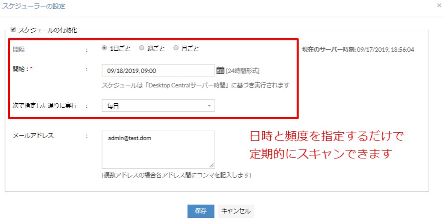 スケジュール/手動でのスキャンに対応し、コンピューターから自動でハードウェア情報を収集、管理画面に反映します。このスキャンにより、IT管理者は常に最新の情報を確認できます。以下の図のように、日時と頻度を指定することで、簡単にスキャンのスケジュールを設定できます。