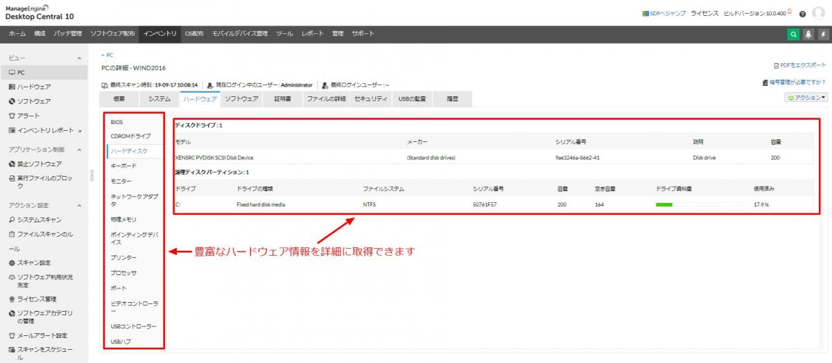 コンピューターにインストールしたエージェントが漏れなくハードウェア情報を収集します。以下の図のように詳細なハードウェア情報を取得できます。
