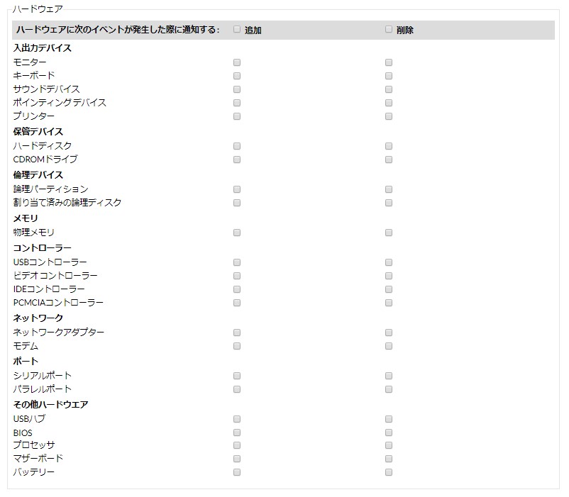 コンピューターから指定したハードウェアが追加/削除された場合に、通知を行います。