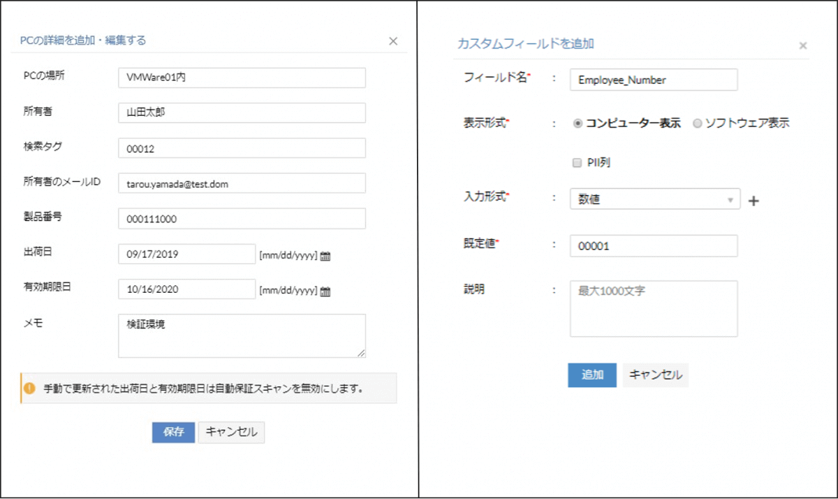 【手動による情報入力画面】/【カスタムフィールドの設定画面】