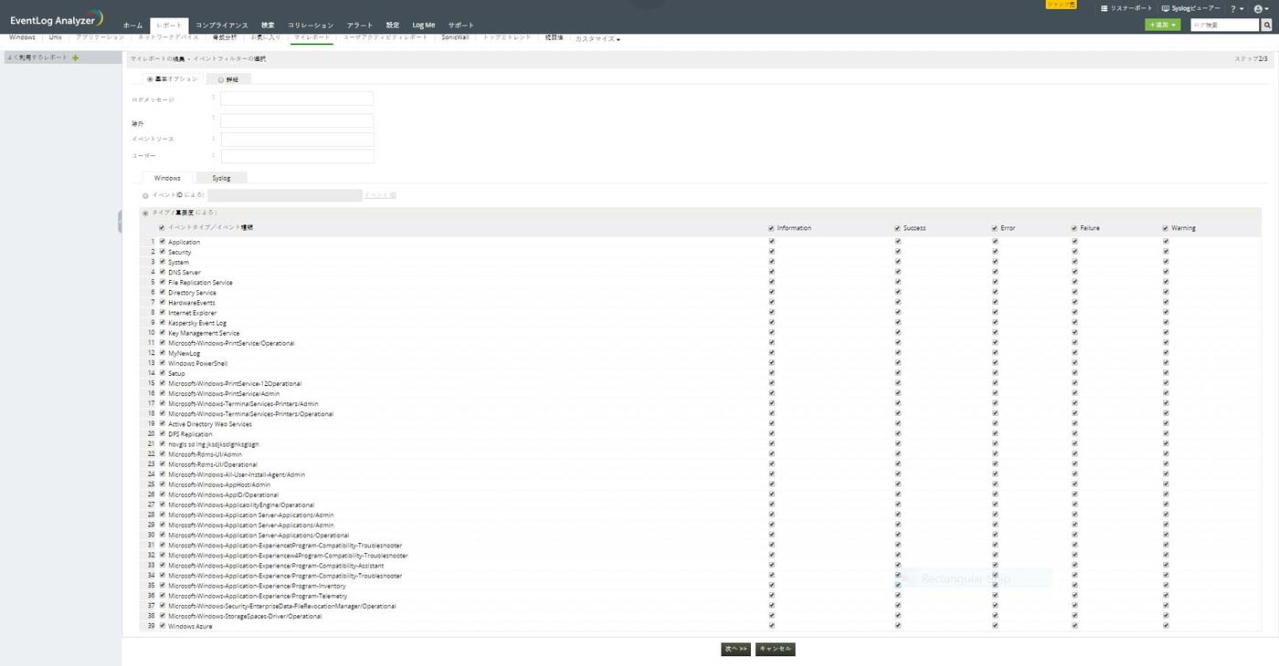 イベントログに関する新しいレポートを、選択されたグループのデバイスから、指定のイベントフィルターに基づいて作成します。重要なサーバーだけを監視して、これらのパラメーターを定期的に自動でレポートするスケジュールを設定します。