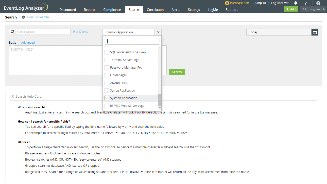 [検索]タブに移動します。ドロップダウンメニューをクリックして[Sysmon]を選択すると、Sysmonアプリケーションのログを検索できます。