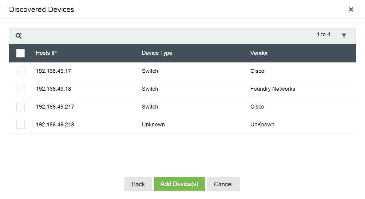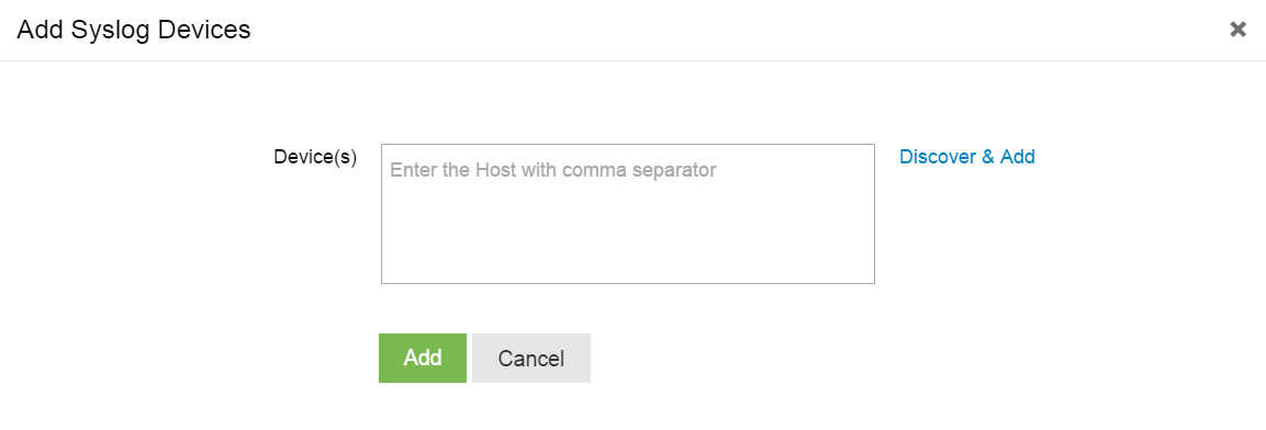 - [Syslogデバイスの追加]画面の[ディスカバリーと追加]をクリックします。IP範囲(開始IPから終了IP)またはCIDRに基づいて、ネットワーク内のSyslogデバイスを検出できます。