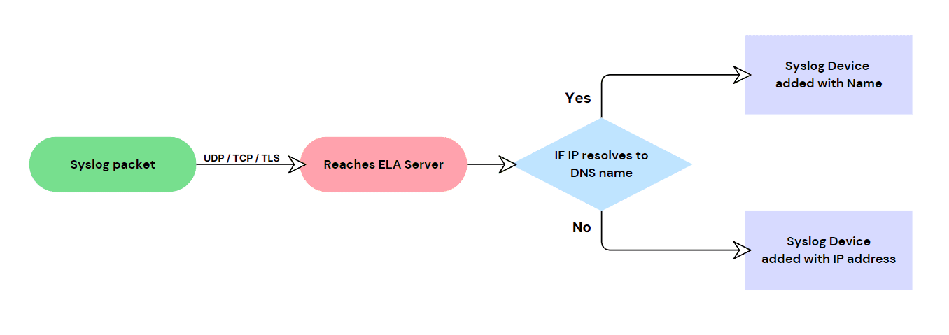 SyslogパケットがEventLog Analyzerサーバーに到達すると、EventLog Analyzerは送信元IPアドレスを判別し、対応する名前に解決しようとします。