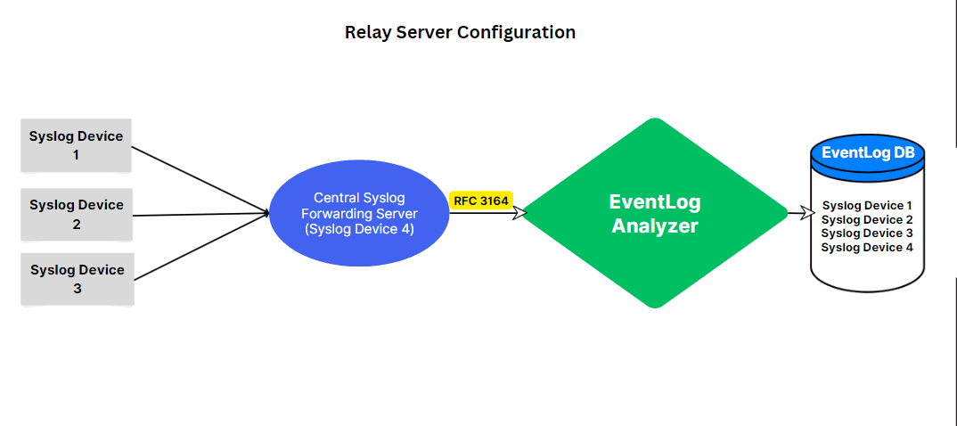 ユースケース:複数のSyslogデバイスがパケットを単一の中央Syslogサーバーに配信し、中央SyslogサーバーがパケットをEventLog Analyzerサーバーに転送します。