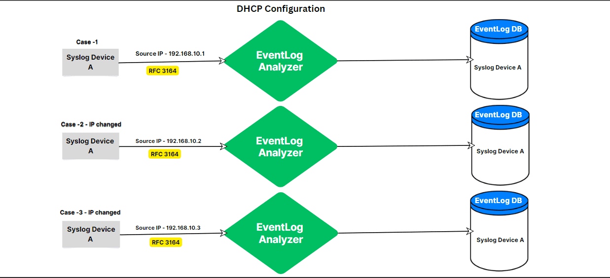 前提条件:すべてのSyslogデバイスからEventlog Analyzerに転送されるSyslogは標準「RFC 3164」に準拠する必要があり、EventLog Analyzerで対応するDHCPの設定が有効になっている必要があります。