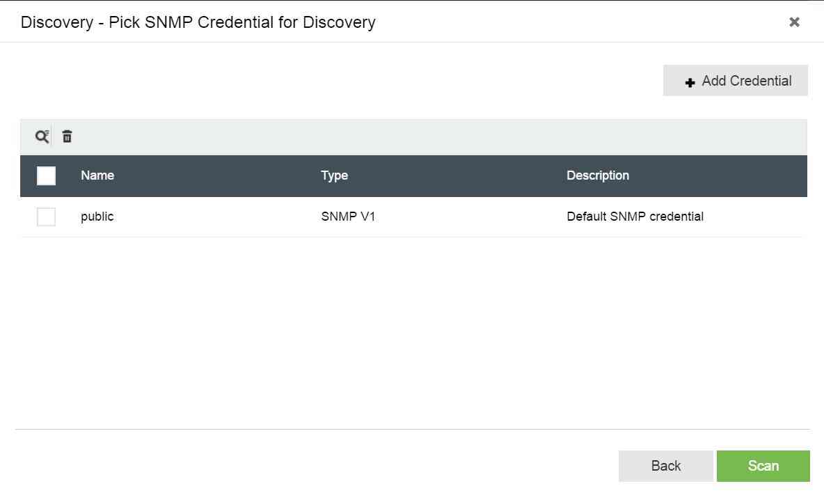 - SNMP認証情報を選択します。デフォルトでは、「public」SNMP資格情報を使用して、ネットワーク内のSyslogデバイスをスキャンできます。