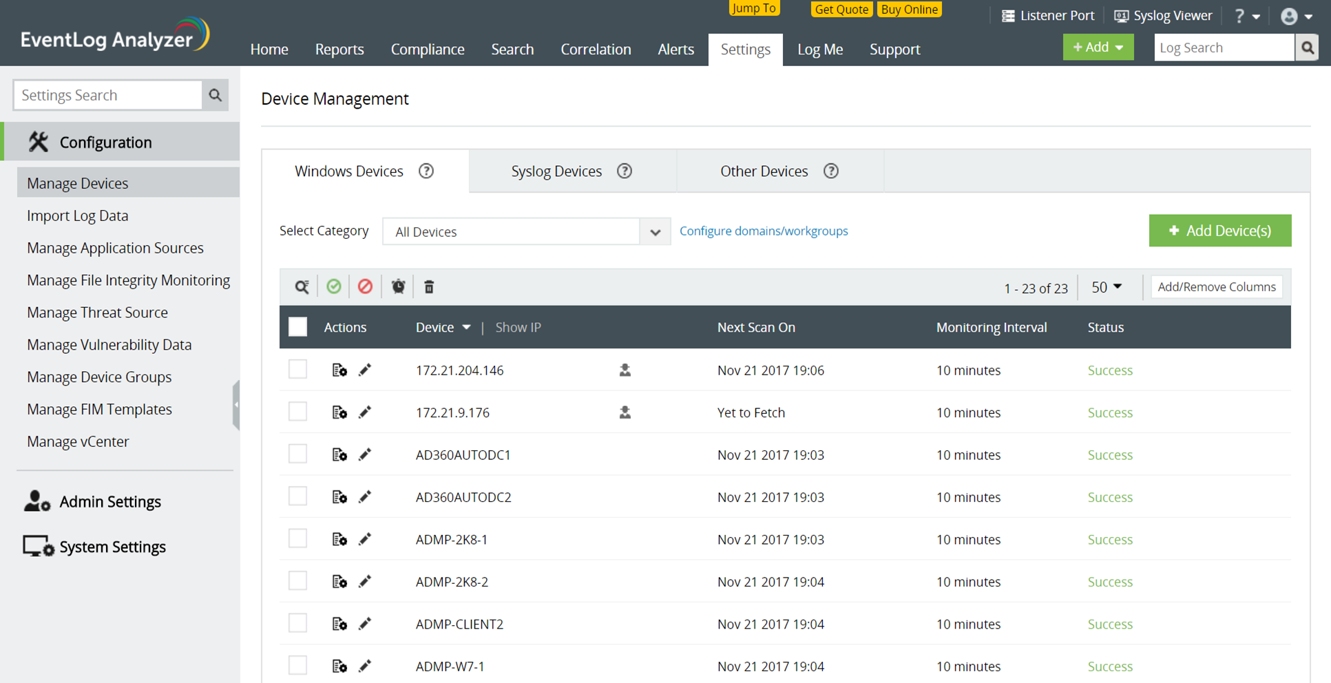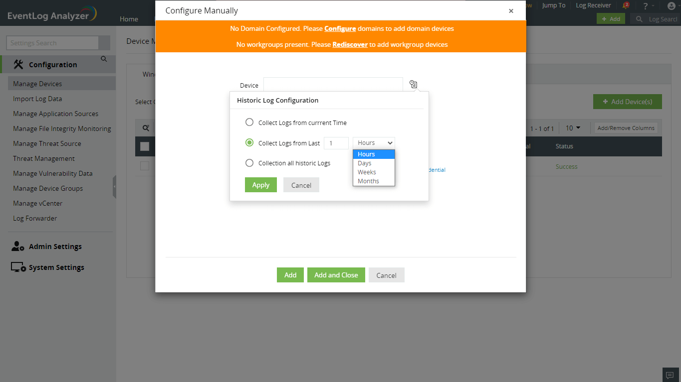 Windowsデバイスを追加する前に、すべてのWindowsデバイスでWMI、DCOMが有効になっていること、および各モジュールやオブジェクトのログ記録が有効になっていることを確認します。WindowsイベントログをSyslog形式で転送するには、SNAREなどのサードパーティツールが必要です。ドメインを追加したり、ドメインまたはワークグループを更新する方法は、ドメインとアカウントをご参照ください。
