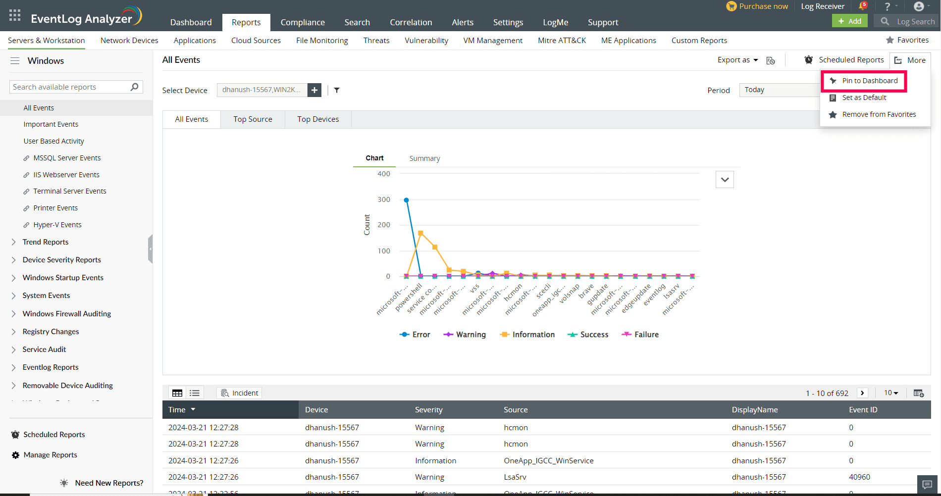 レポートをEventLog Analyzerのダッシュボードに固定して、素早く参照することができます。