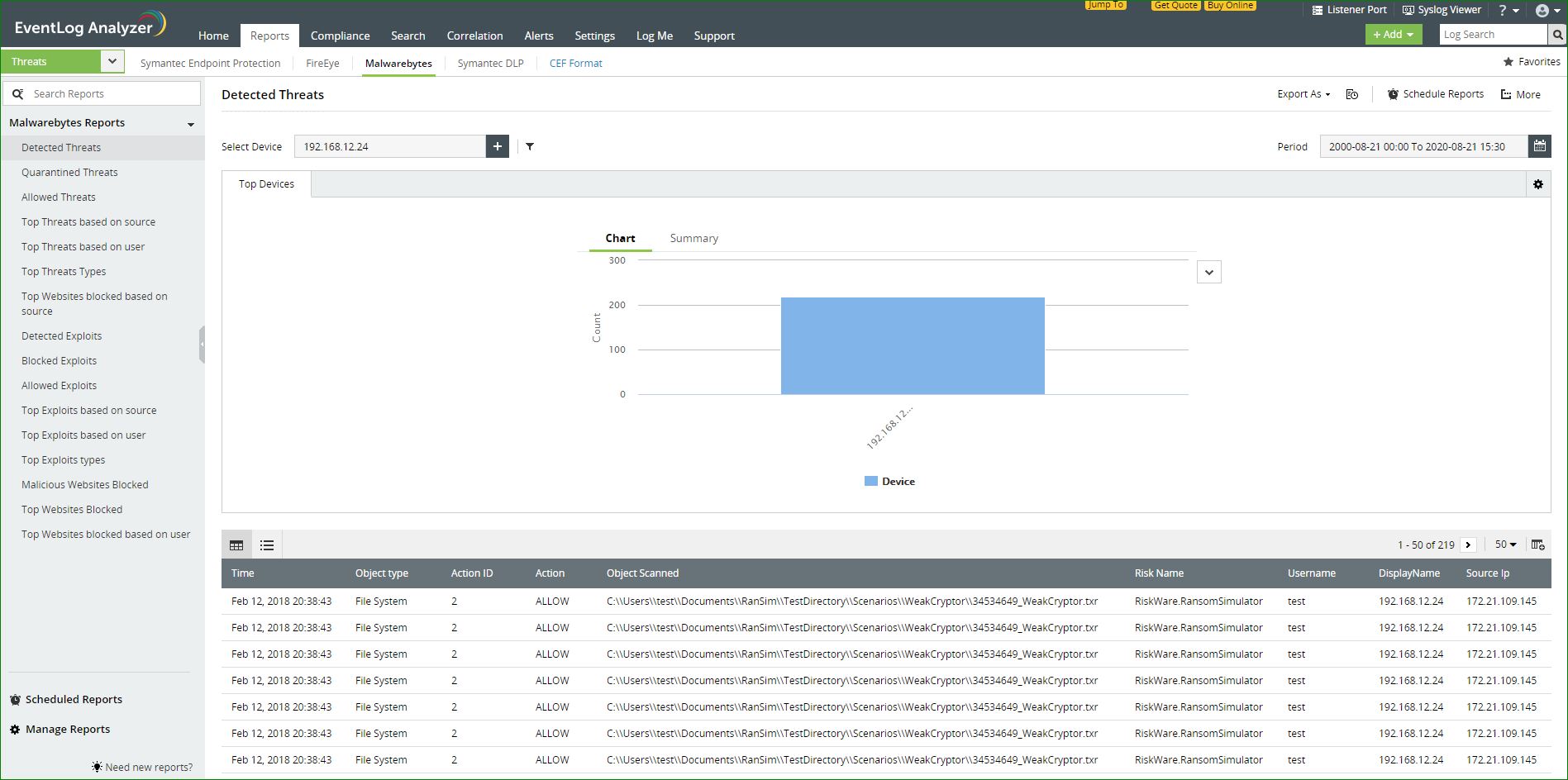 EventLog Analyzerは、Symantec Endpoint、Symantec DLP、FireEyeなどの脅威インテリジェンスソリューションからのログデータのサポートを提供します。このソリューションは、外部のセキュリティ脅威を早期に検出および軽減するのに役立ち、すぐに使用可能なレポートおよびアラート条件を提供します。事前定義されたレポートは、PDF/CSV形式でエクスポートできます。サポート対象の脅威ソースは以下のとおりです。