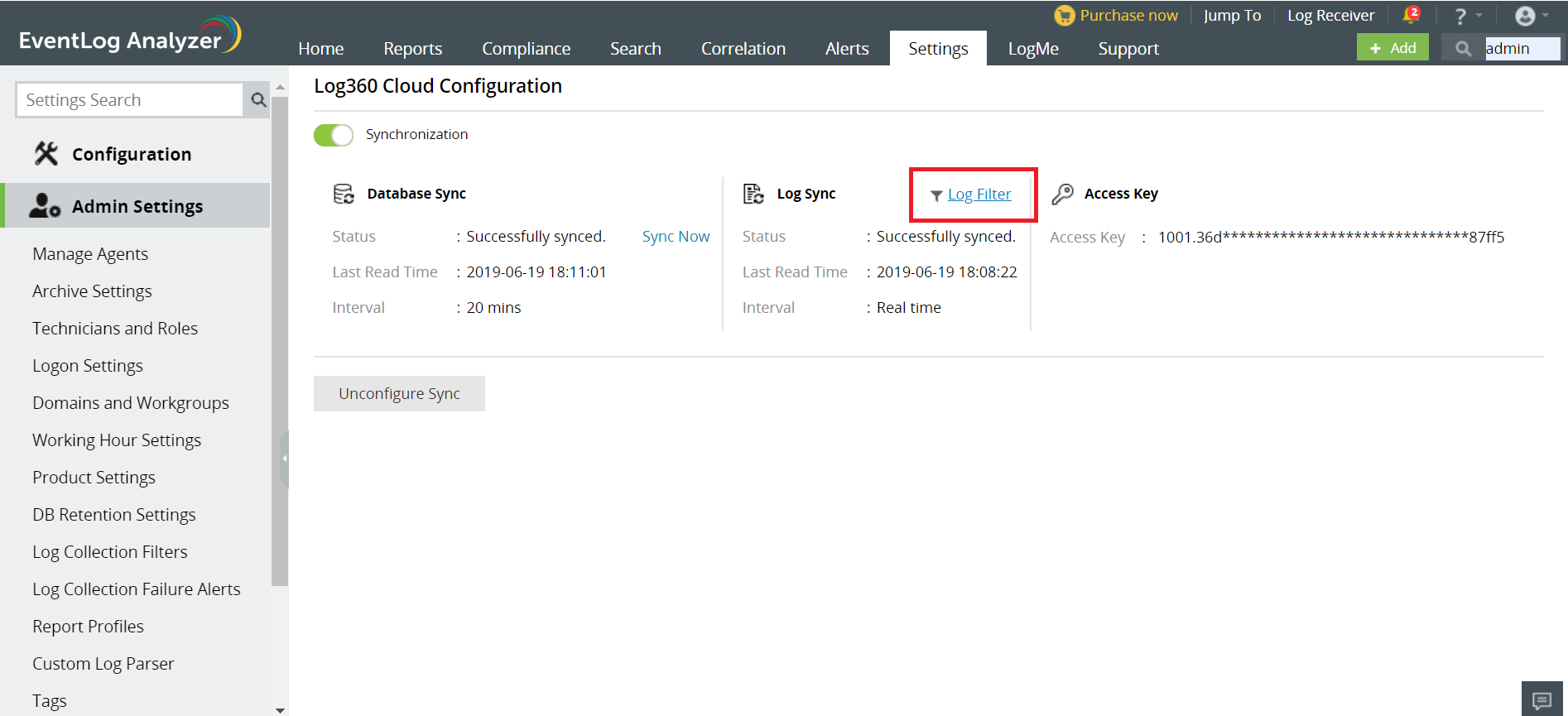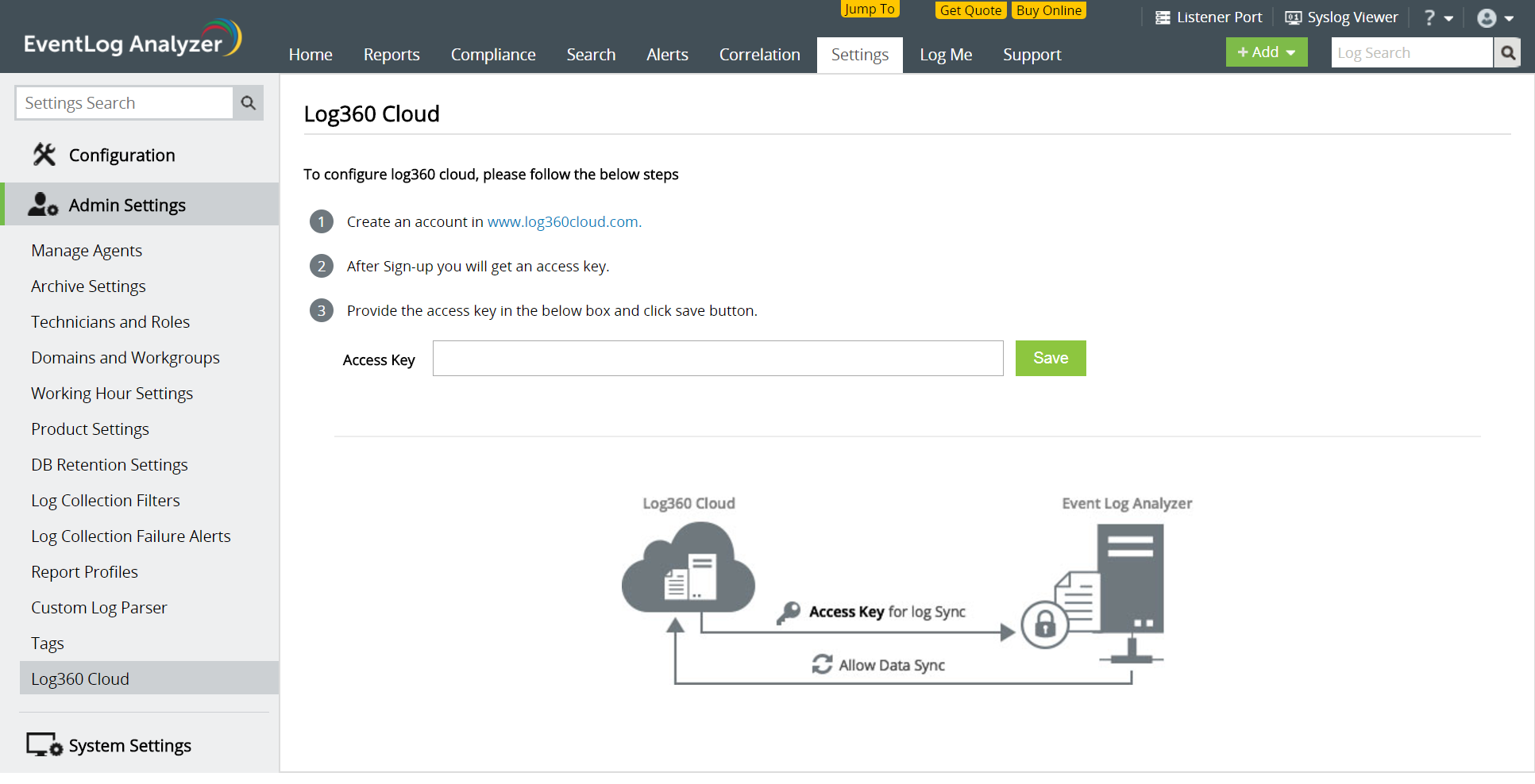 Log360を利用しており、ローカルの EventLog Analyzerからデータを受信するためには、Log360 Cloud のセキュリティアクセスキーを取得し、ローカルのEventLog Analyzer にて設定する必要があります。