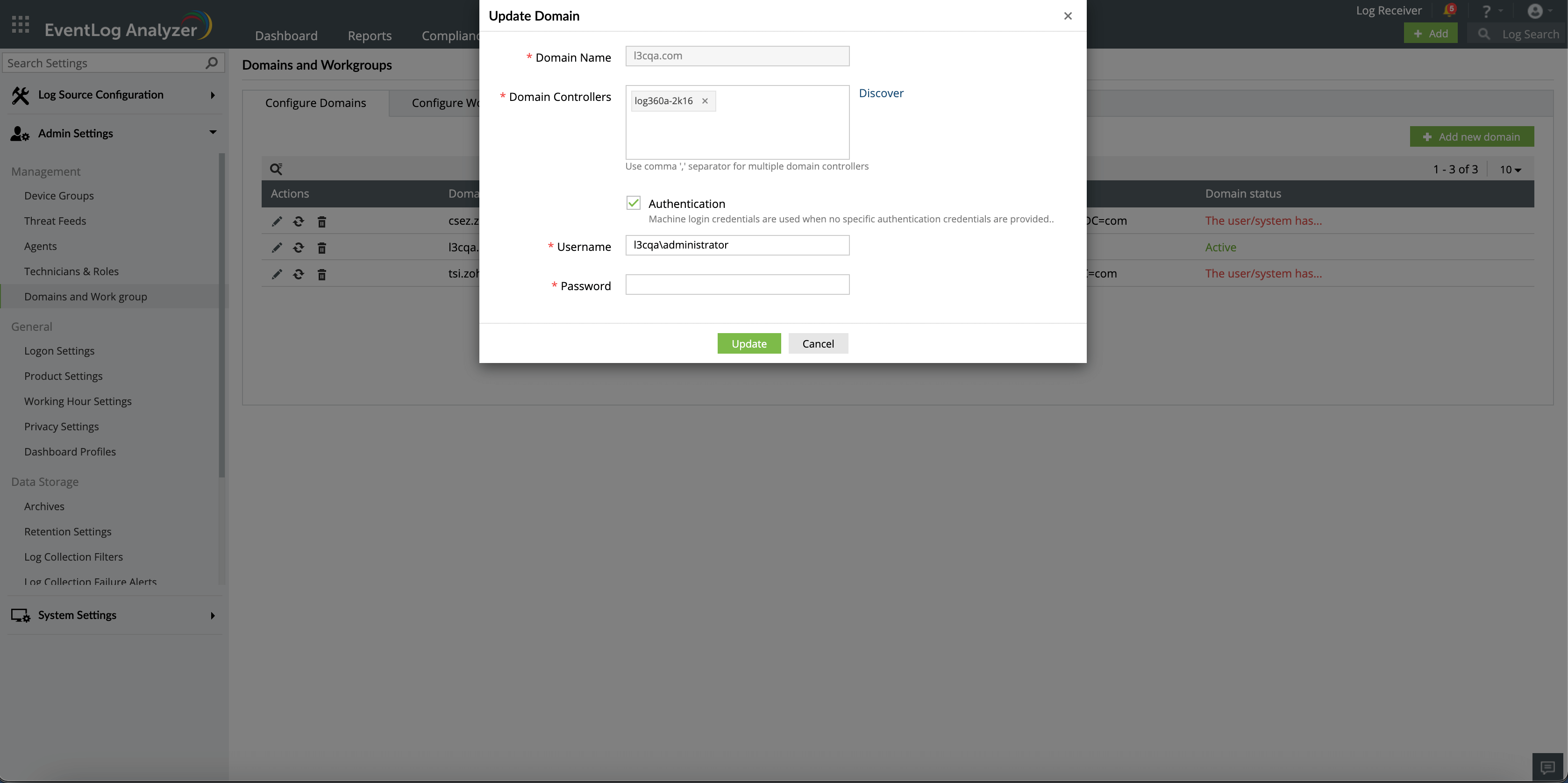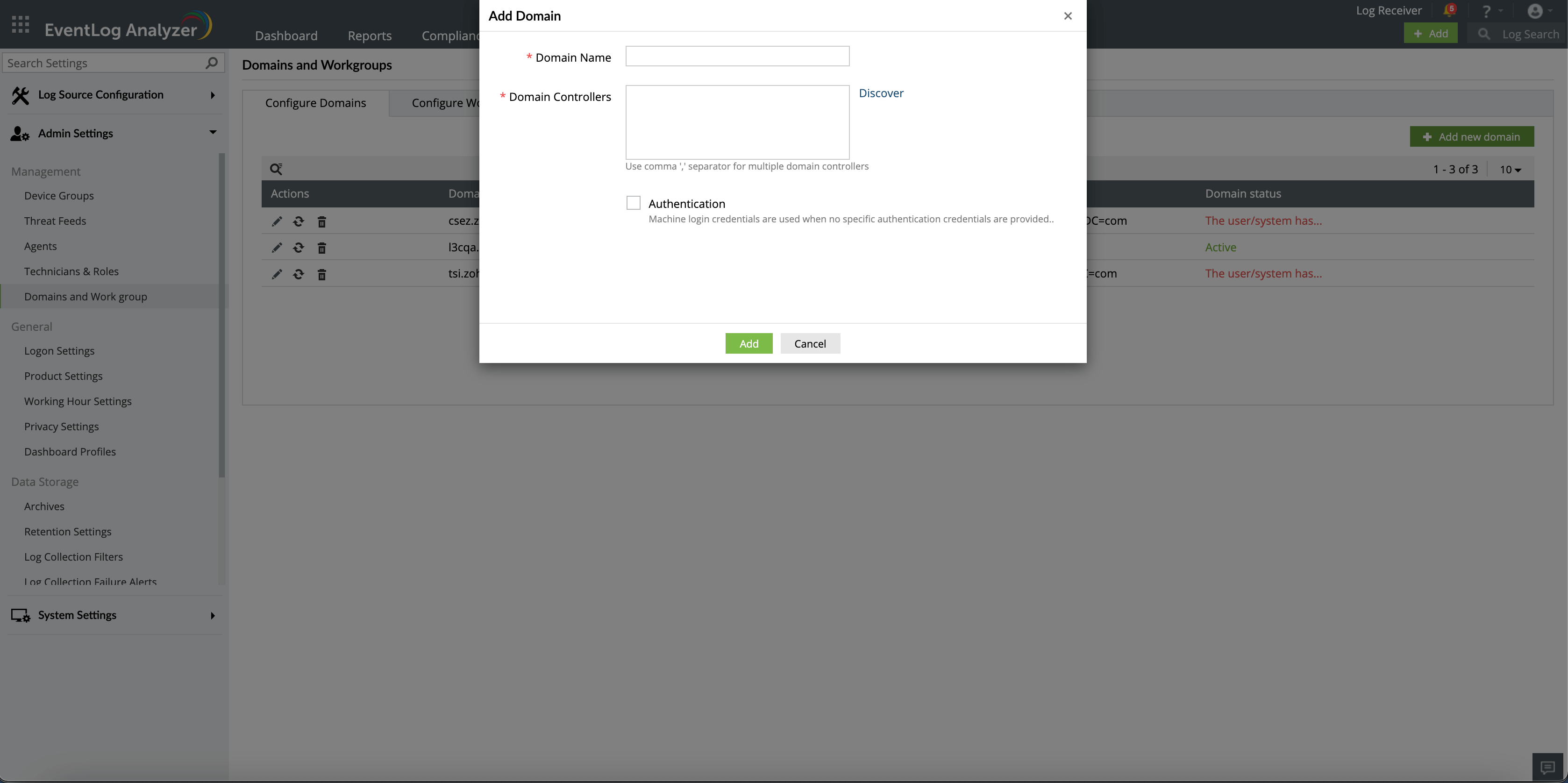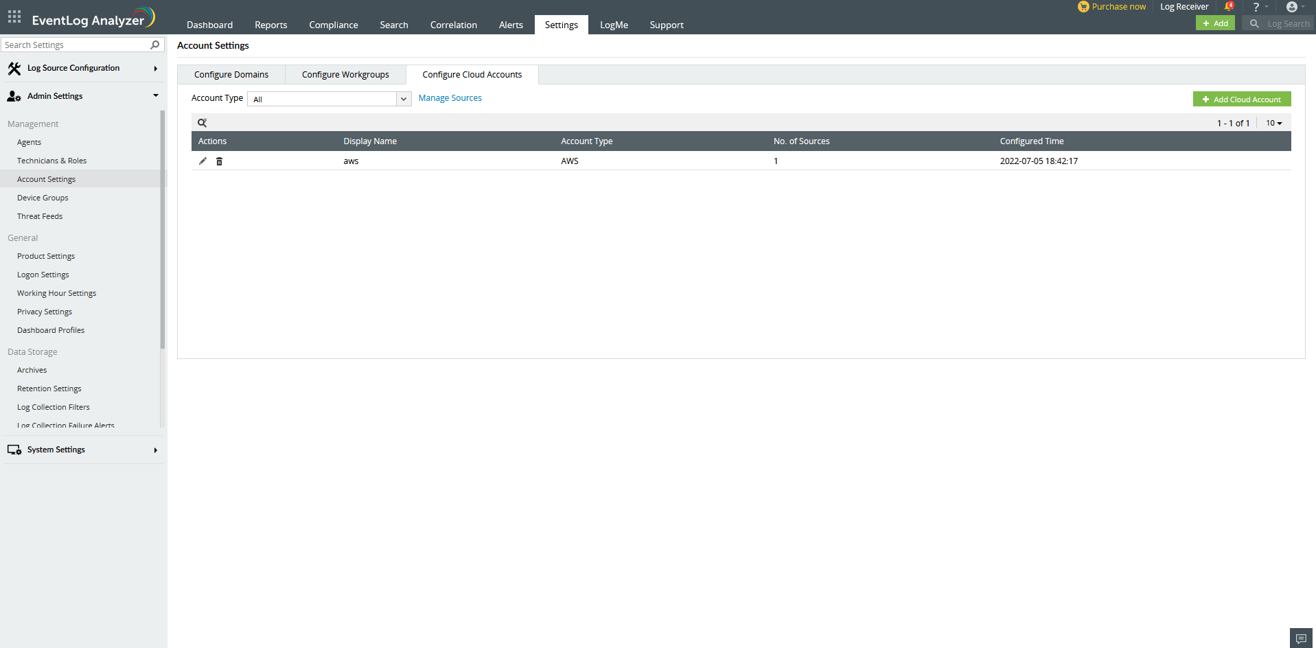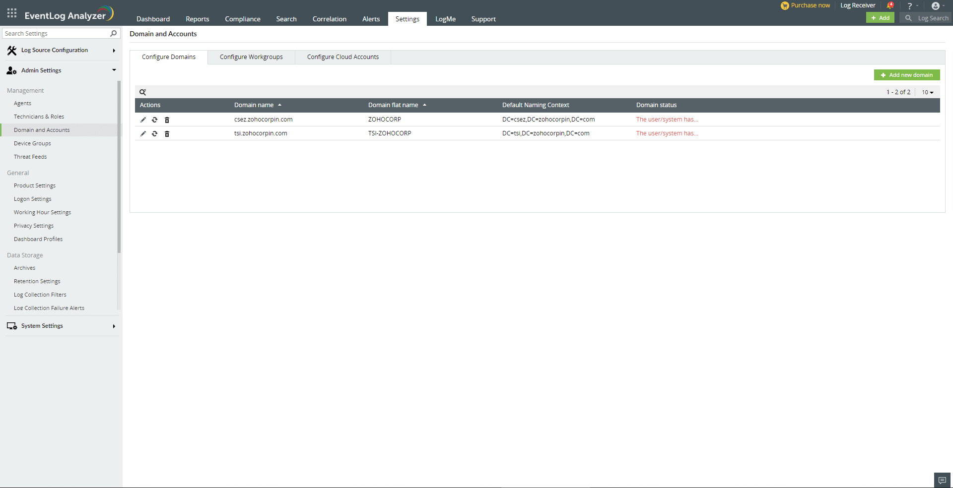 [ドメインとアカウント]画面には、EventLog Analyzerによって検出されたすべてのActive Directoryドメインとワークグループが一覧表示されます。また、EventLog Analyzerに追加されたすべてのクラウドアカウントも一覧表示されます。各アイコンをクリックすることで、ドメイン、ワークグループ、またはクラウドアカウントの更新/リロード/削除が可能です。