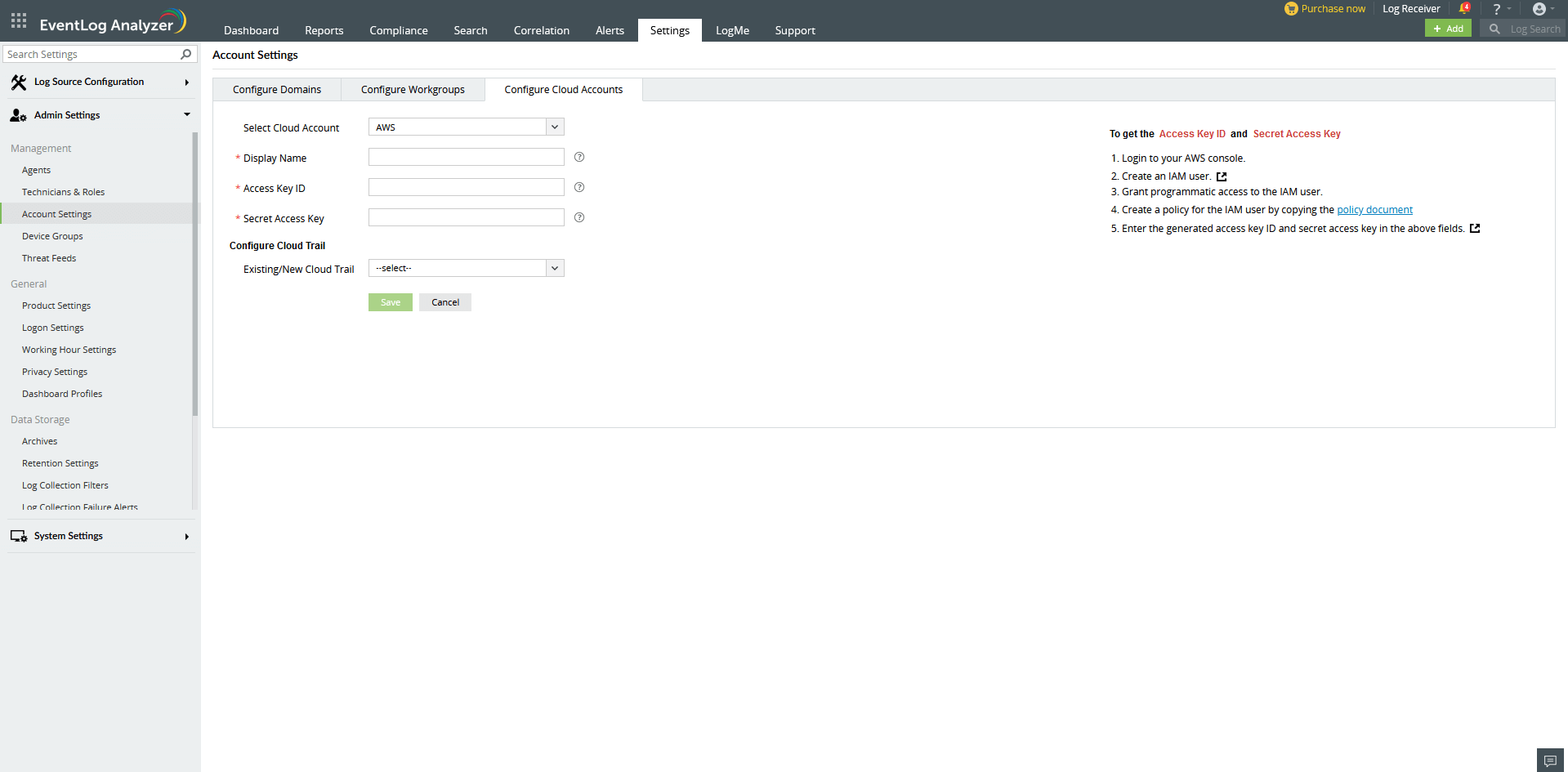 EventLog Analyzerは、AWSからCloudTrailログ、S3サーバーアクセスログ、ELBアクセスログを収集します。