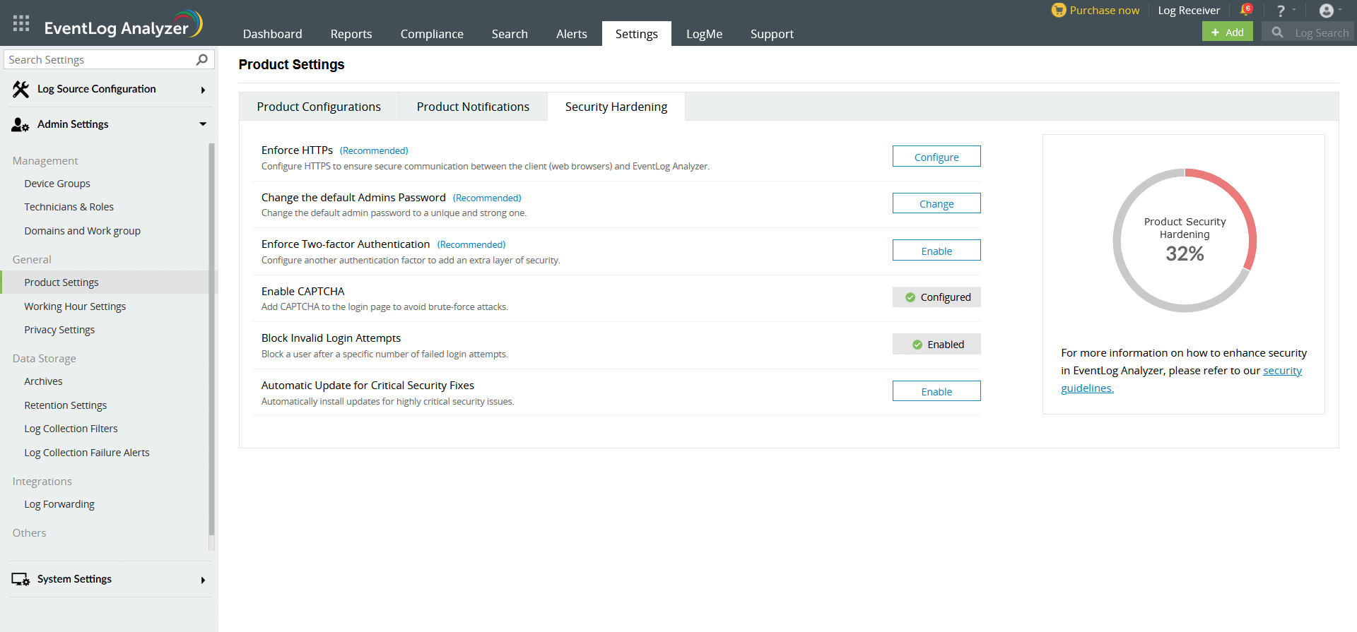 EventLog Analyzerは、アカウントのセキュリティを強化するためのセキュリティ設定を提供しています。[セキュリティ強化]画面では、セキュリティ設定を単一ページで設定および管理することができます。
