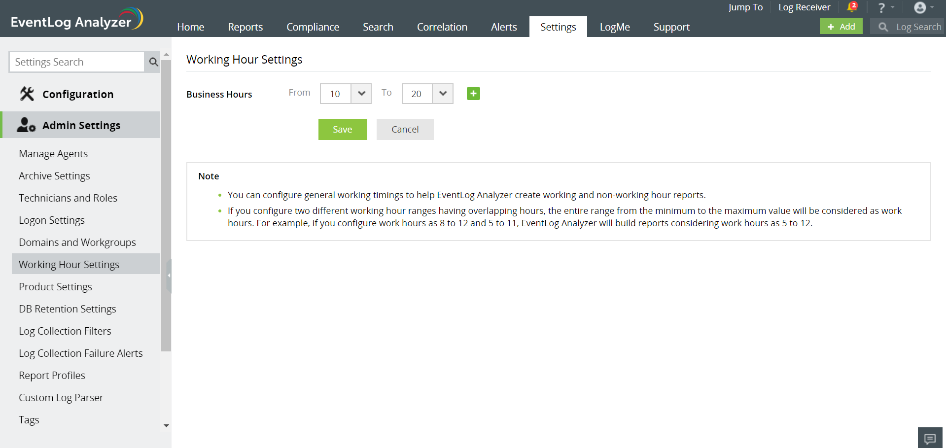 注記:時間範囲が重複する2つの業務時間が設定されている場合、EventLog Analyzerは最小値から最大値までの範囲を業務時間に設定します。